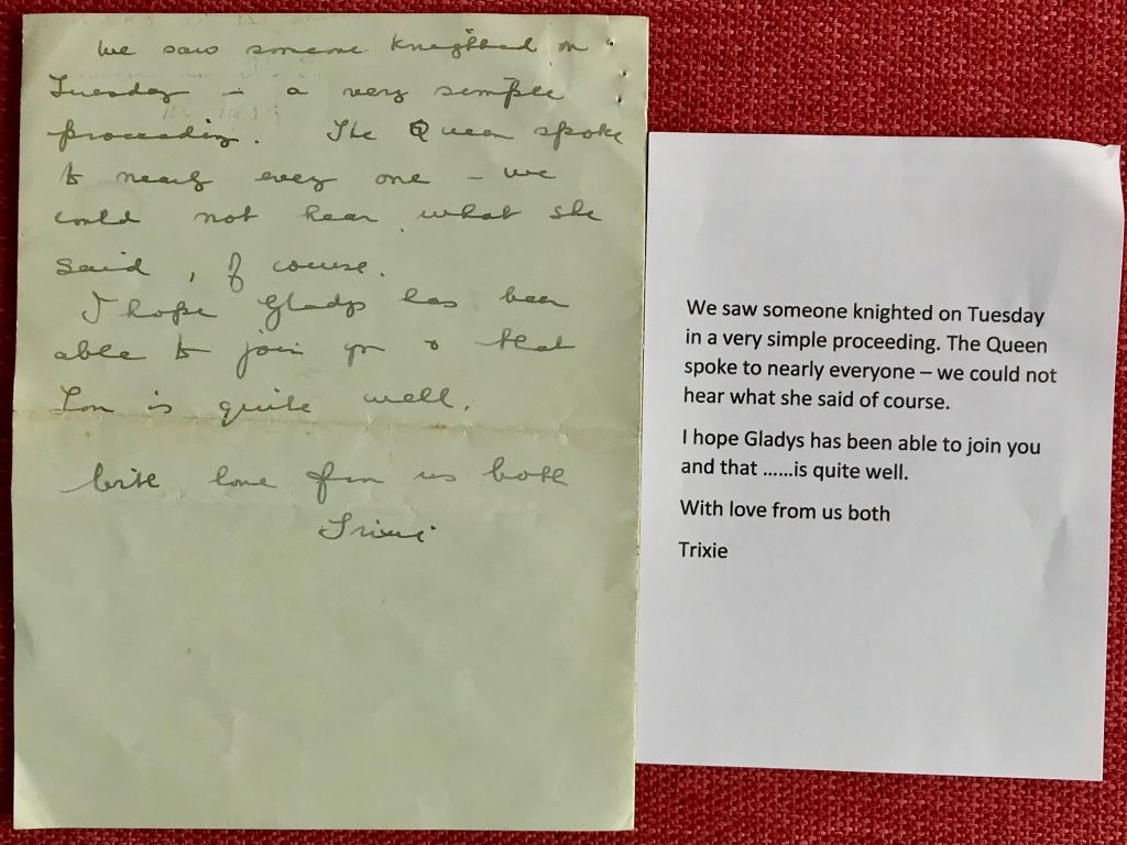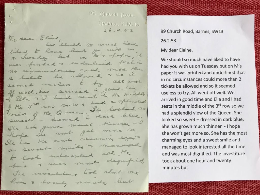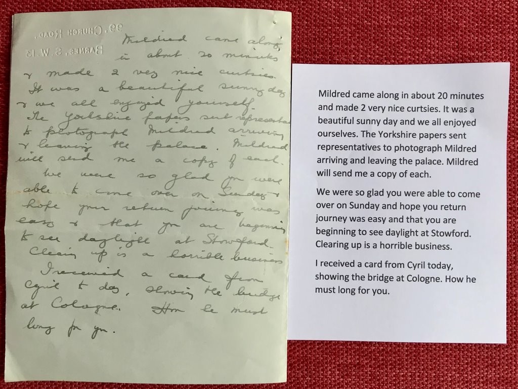 Two of Mildred's sisters, Ella and Trixie were given tickets for the presentation at Buckingham Palace. Here is Ella's detailed description of the occasion, including an extraordinarily detailed description of the beautiful, young Queen Elizabeth. Below is a transcript of a letter from Trixie to Elaine Hooke, apologising that only two people were permitted to attend with Mildred and including her description of the Queen and the occasion.