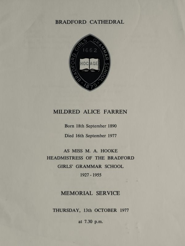 Below is the Funeral Order of Service and below that a Eulogy delivered at Mildred's funeral.by Mr Foster Beaver. These were sent to George & Valerie Hooke by Bradford Girls Grammar School, following their attendance at her funeral.